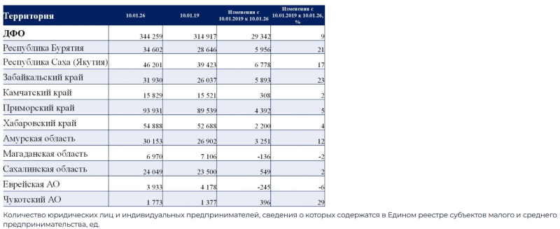 Количество субъектов малого и среднего бизнеса на Дальнем Востоке к 10 января 2026 года достигло 344 259 человек. Как подчеркивают эксперты ФАНУ «Востокгосплан», это максимальный показатель предпринимательской активности в макрорегионе с 10 января 2019 года.