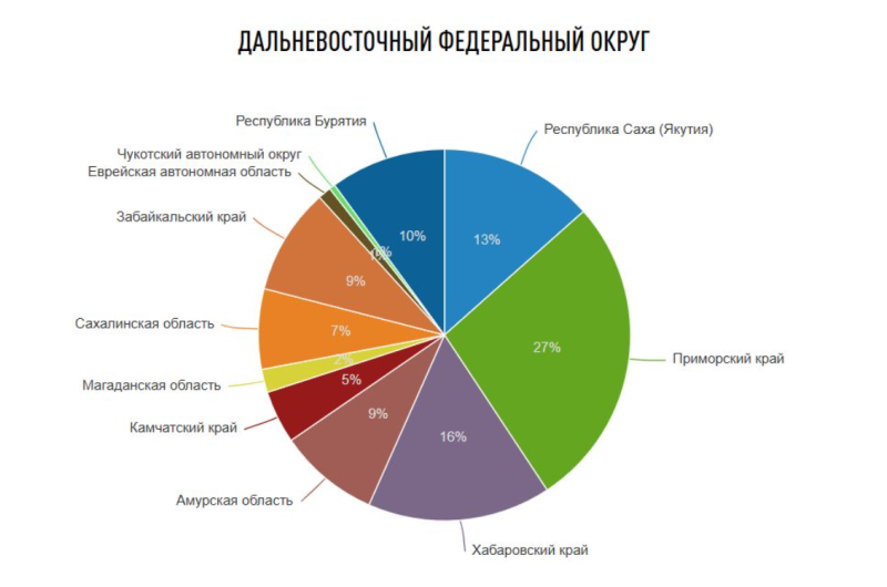 Больше половины субъектов МСБ, зарегистрированных в ДФО, приходится на три региона – Приморский (27%) и Хабаровский (16%) края, Якутию (13%). Значительный процентный прирост субъектов малого и среднего предпринимательства демонстрирует Чукотский автономный округ: почти 29 % (396 ед.) с 2019 года.